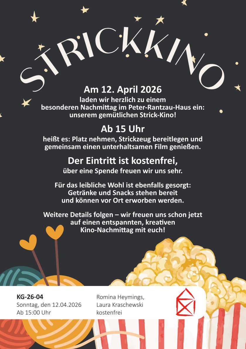 Wir laden Sie herzlich ein zum Strick-Kino am 12. April 2026 ab 15 Uhr. Für das leibliche Wohl ist gesorgt, Getränke und Snacks können vor Ort erworben werden.